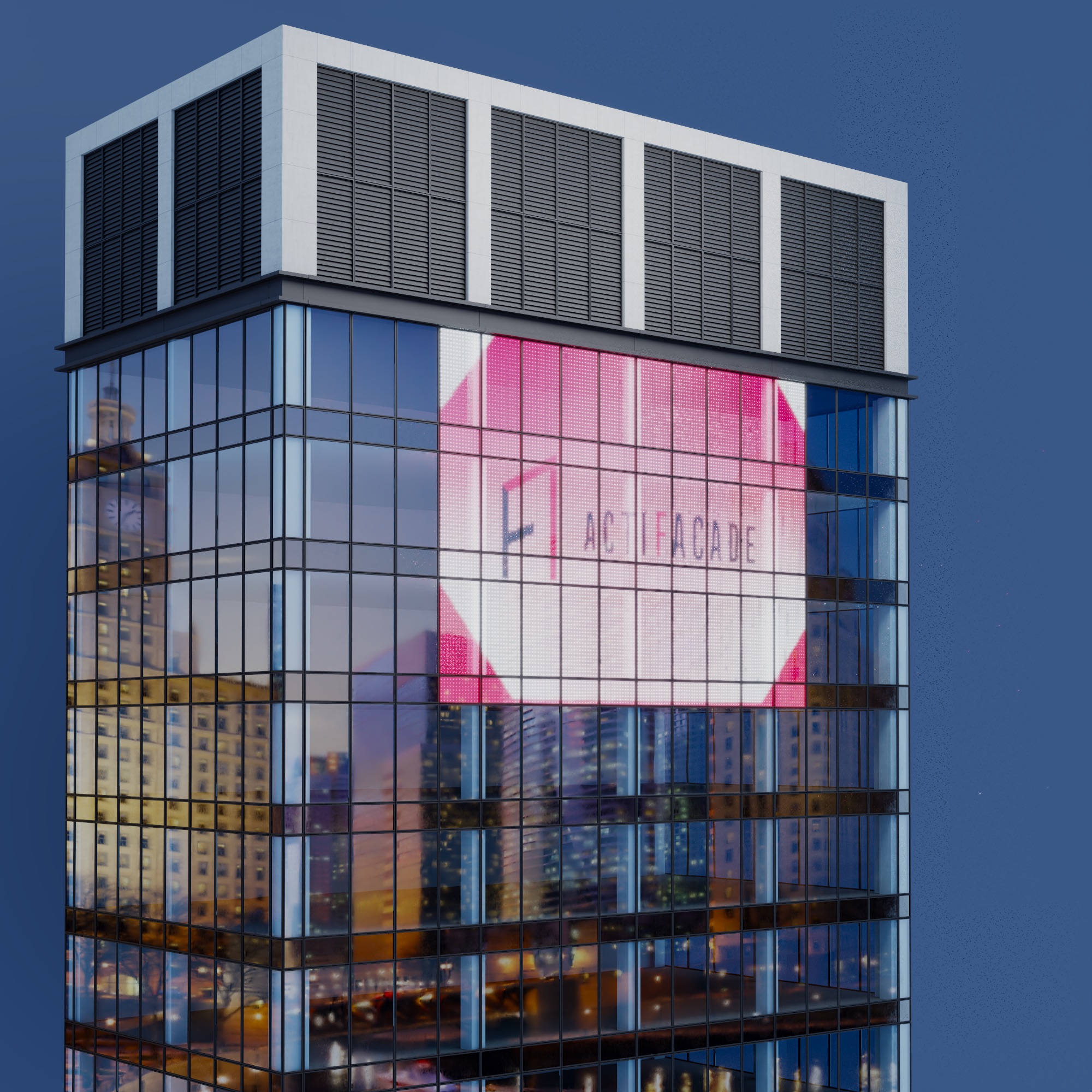 Thanks to the discreet LEDs embedded in the façade modules, made out of glass or metallic cladding, the façade remains quiet and neutral when the sun shines, like any other façade. When the sun sets, it starts a second life and becomes a gigantic screen, illuminating the neighbourhood with spectacular videos and animations visible from a distance.